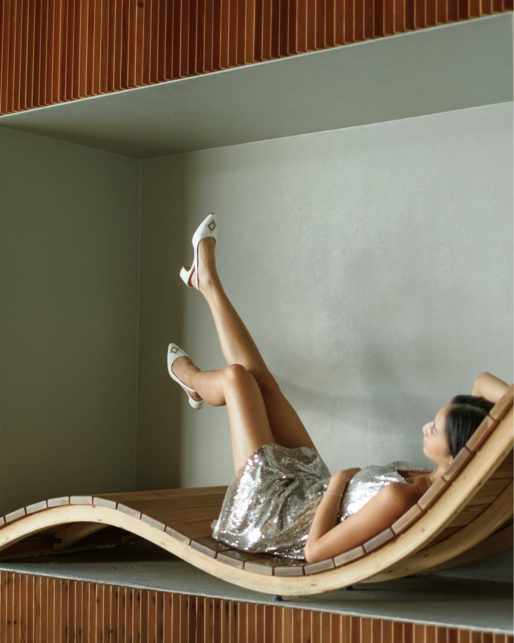 Slingback with 45mm heel and the brand’s 3D Diamond embroidery. Metallic reflective yarns deliver a gem‑like shine on smooth white patent.