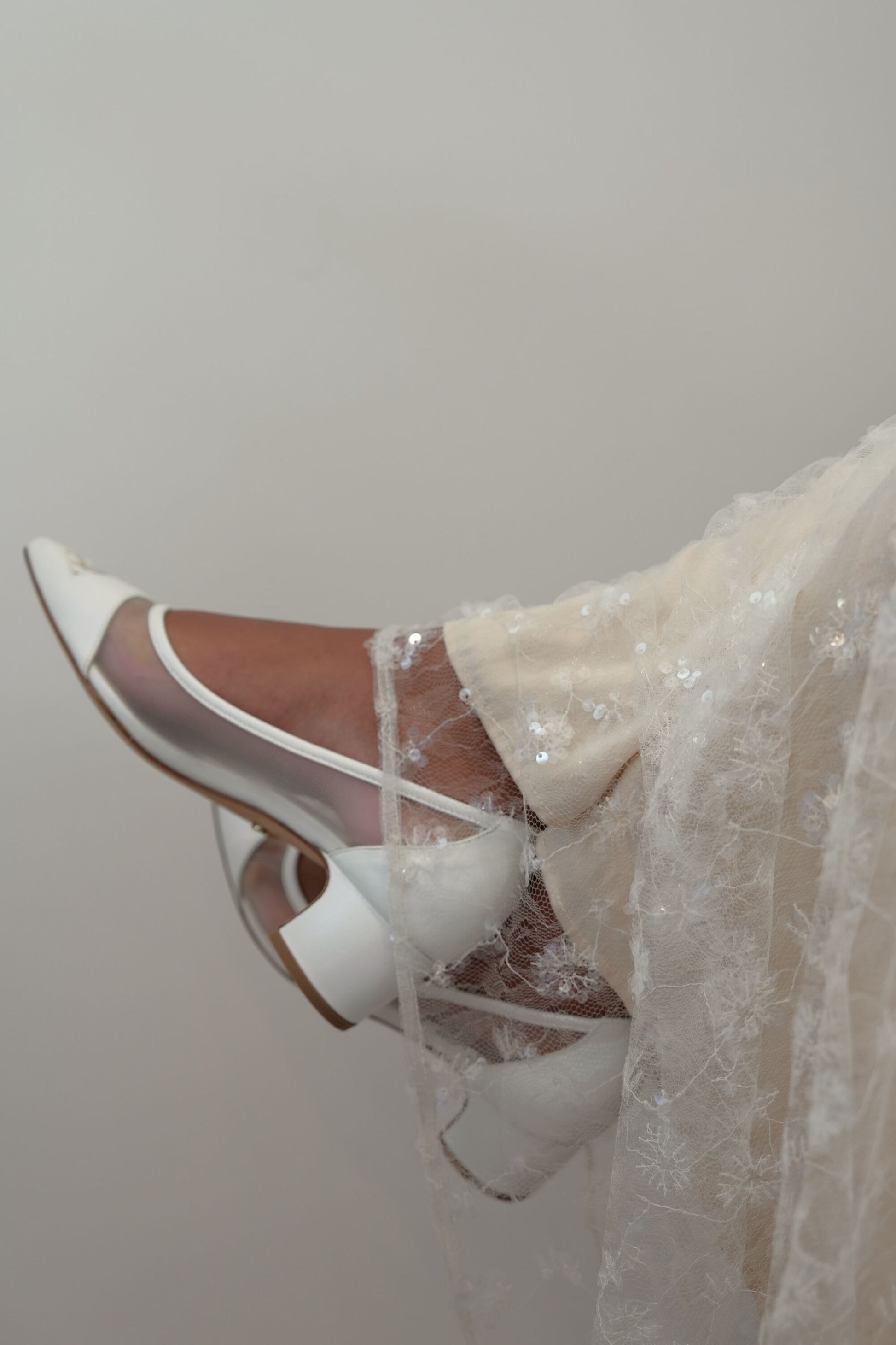 Mesh pump with ATANA’s signature Fiorellini embroidery, set on a 45mm kitten heel. Layered frosted threads catch the light for jewelry‑like shimmer.