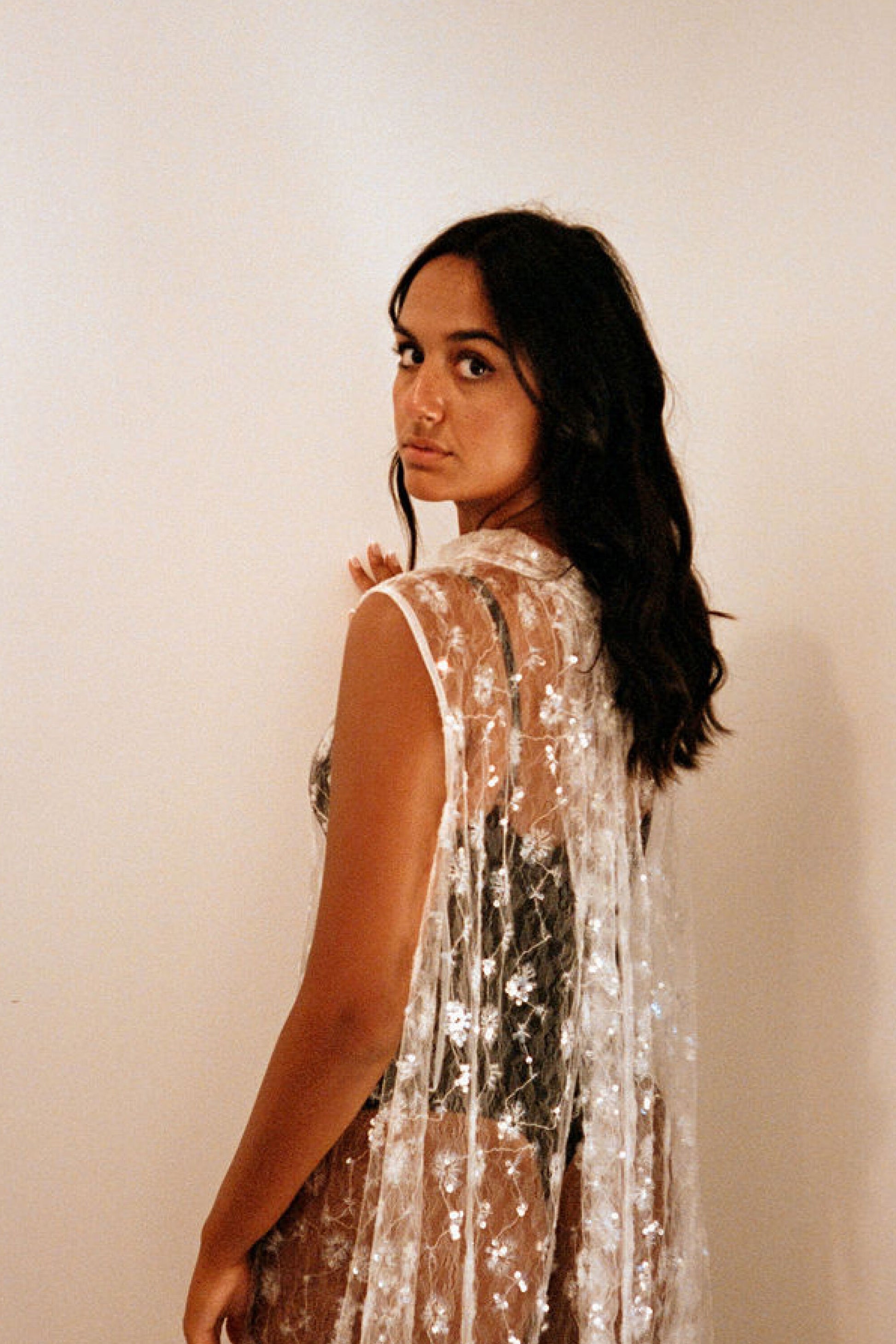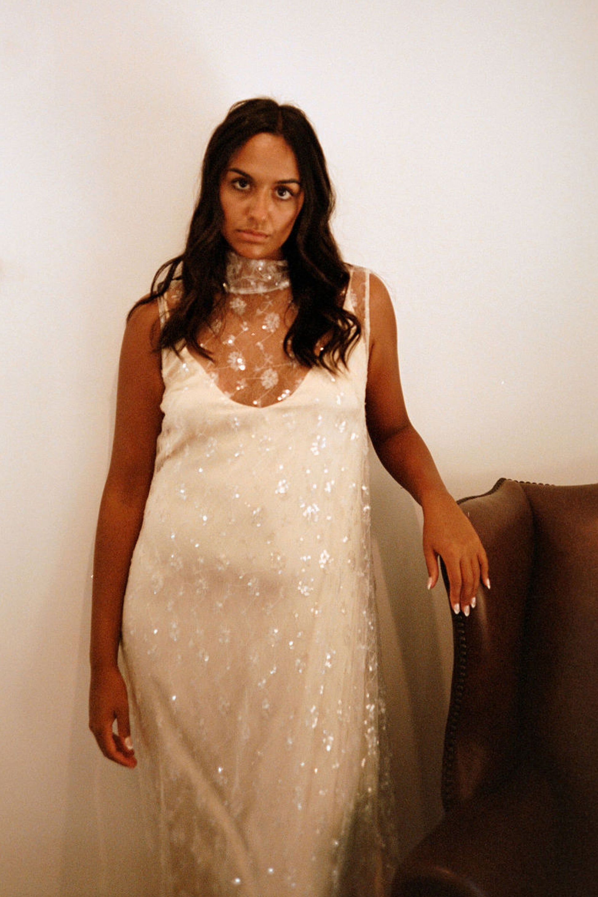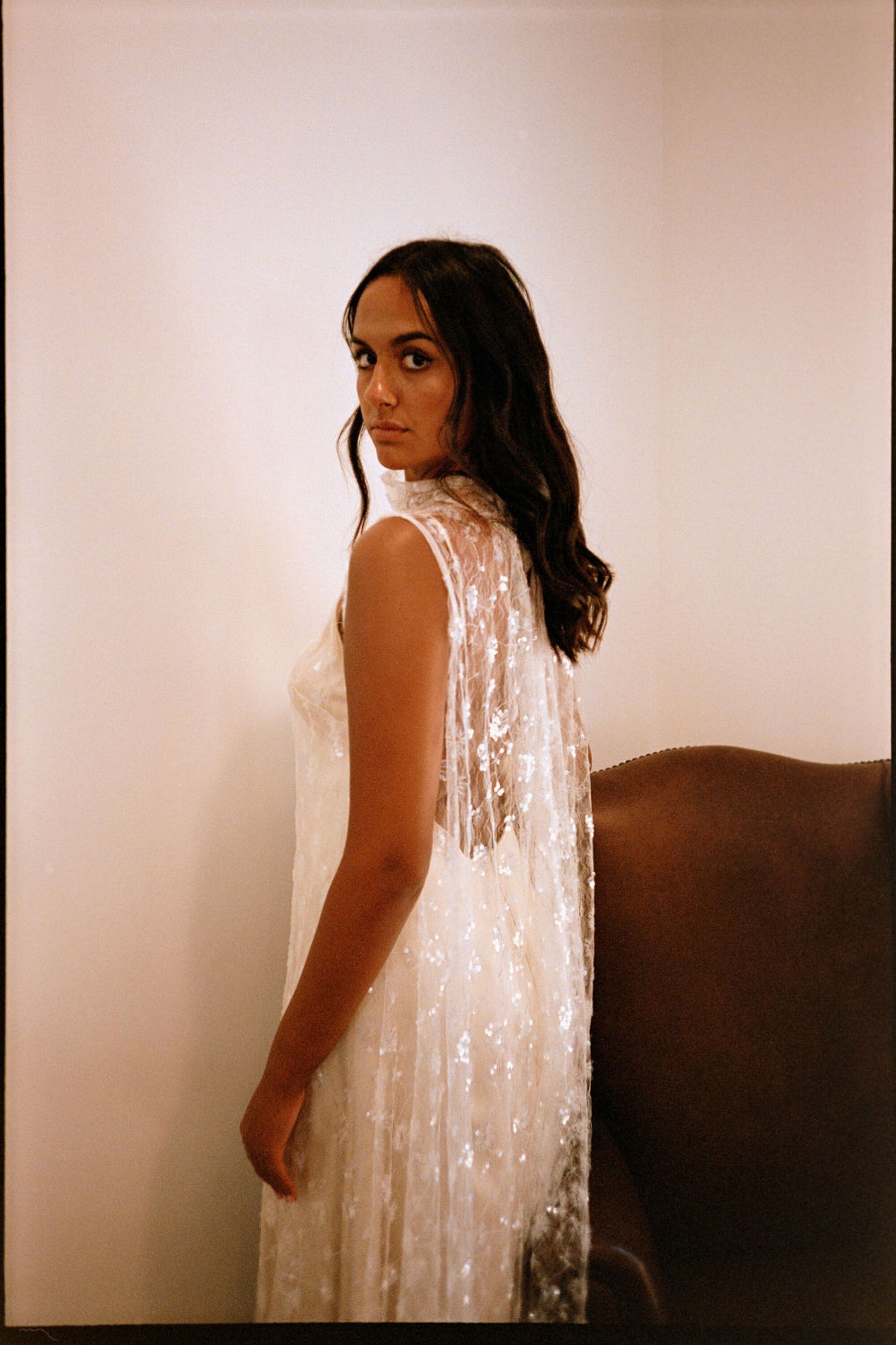 Cosette shimmers — a sequin lace overlay with a modern mock neck and feather‑light train. Slip it over columns or minis for a luminous second‑look moment. Handmade to order in limited quantities, each piece celebrates slow fashion and artisanal design.