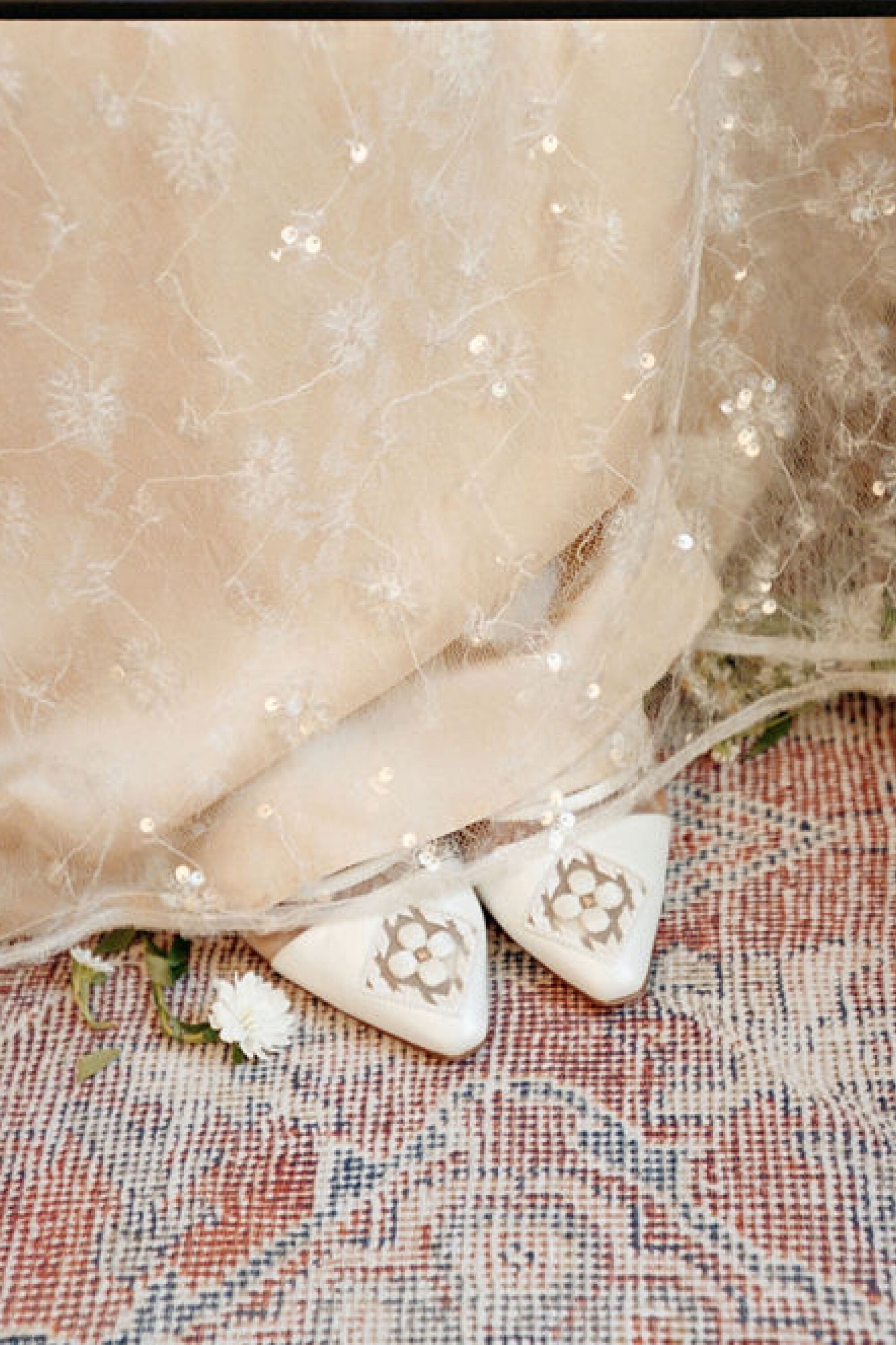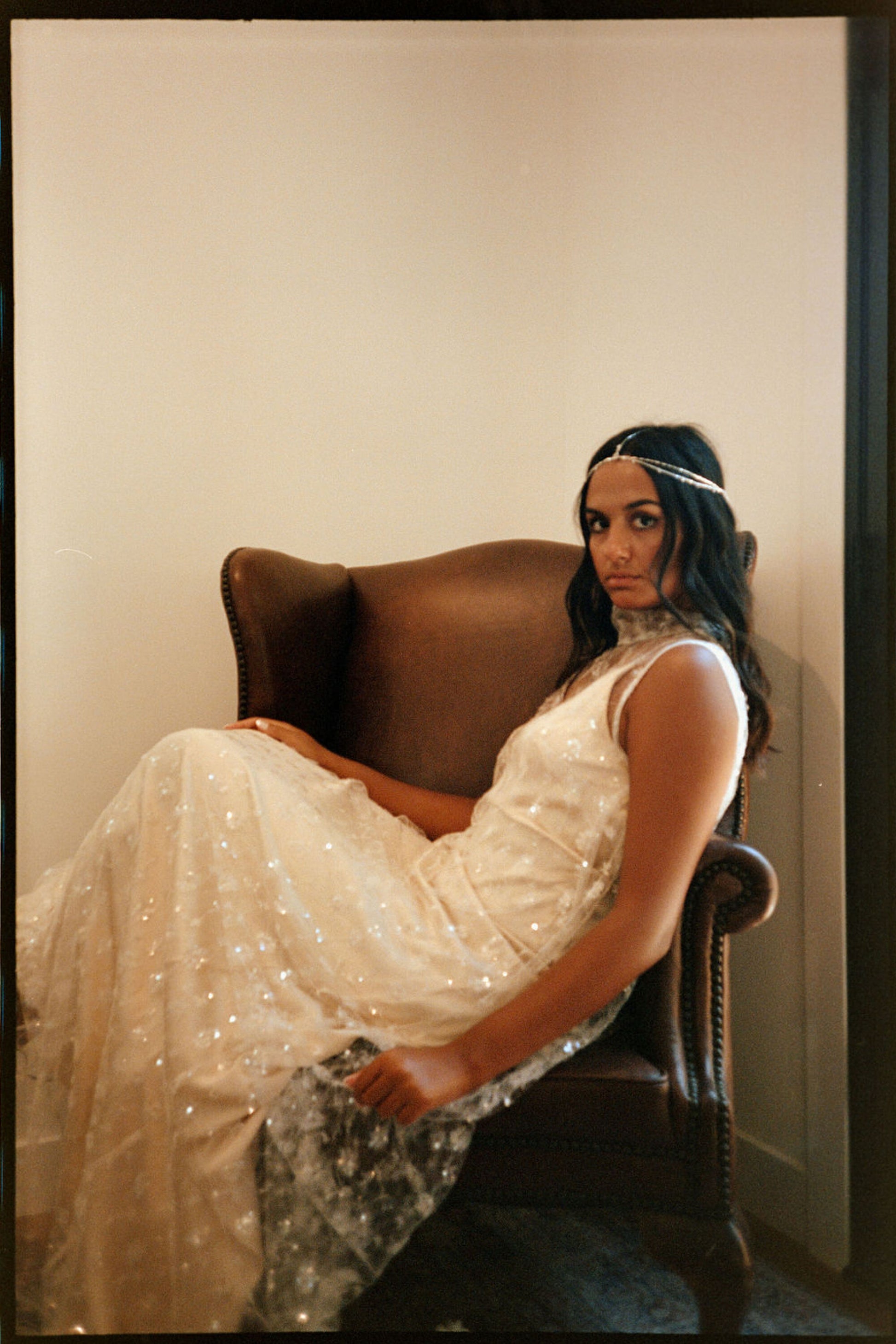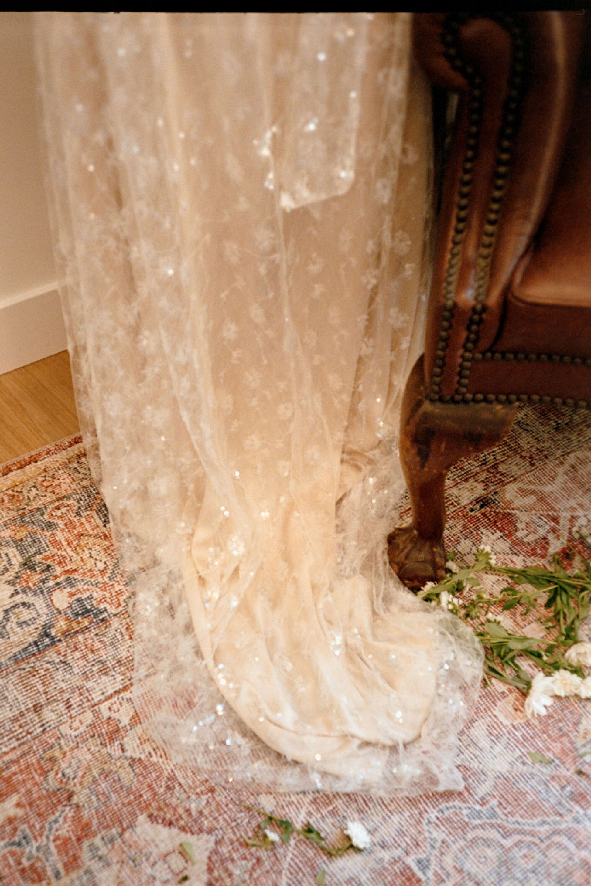 Cosette shimmers — a sequin lace overlay with a modern mock neck and feather‑light train. Slip it over columns or minis for a luminous second‑look moment. Handmade to order in limited quantities, each piece celebrates slow fashion and artisanal design.