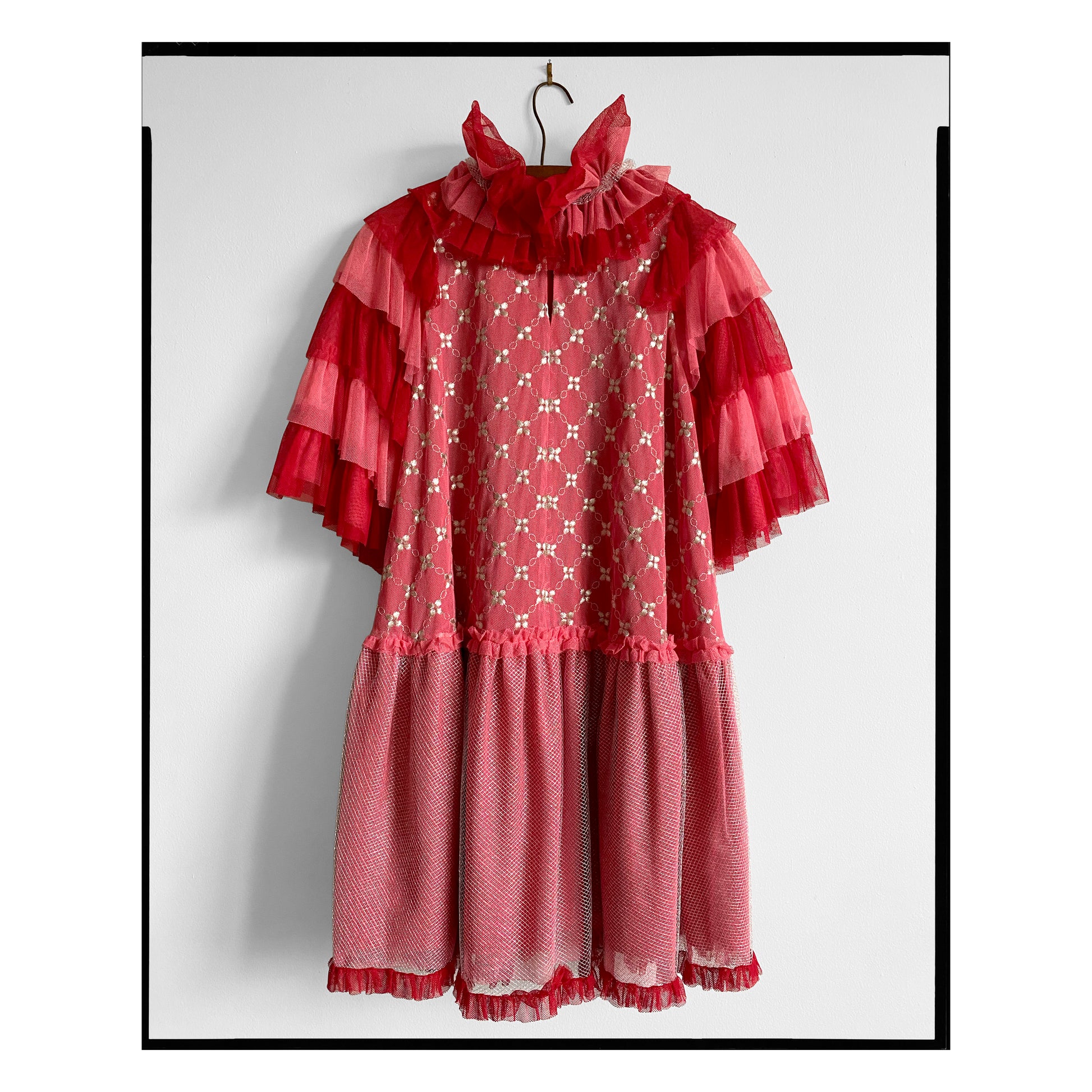 Silver ore embroidery— in a clover diamond pattern— is the focus of this mini shift dress. A color blocked Pierrot inspired ruffle details the neckline. The sleeves create a soft bell shape, with 5 layers of ruffles on each. The dropped waist skirt creates extra fullness with one layer of pink tulle and a second in metallic silver. A red mini ruffle adds detail at the hem. Crafted in Italian cotton tulle and embroideries.