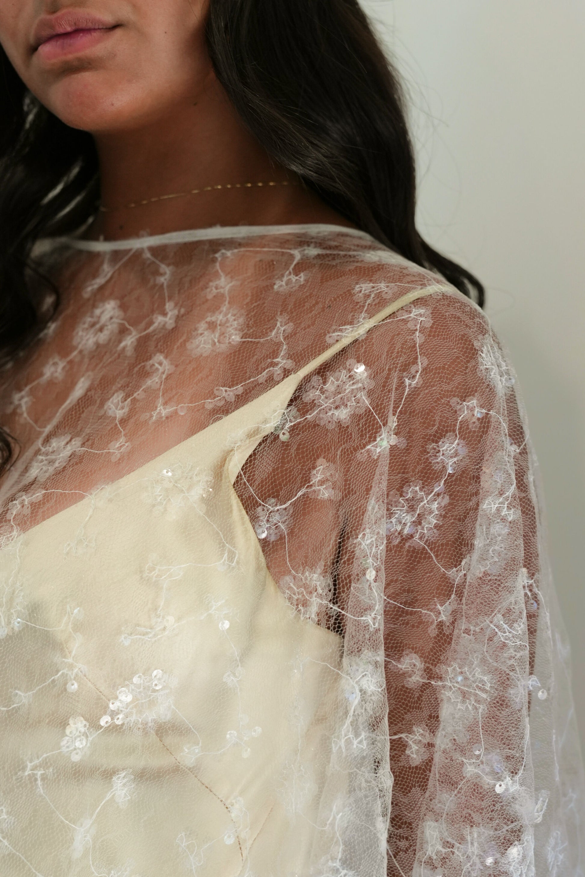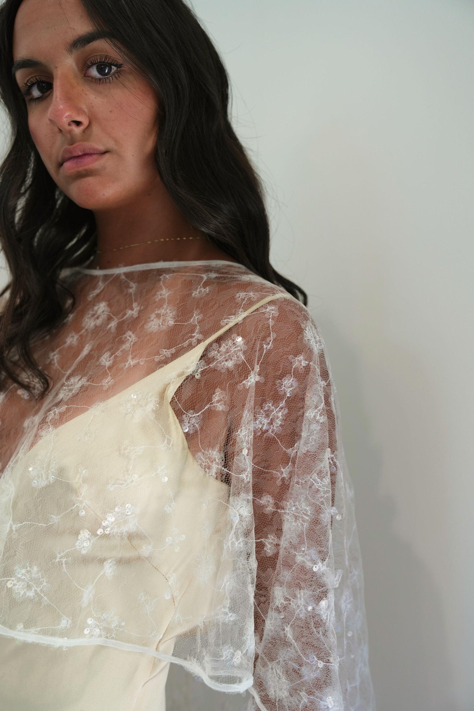 A soft shimmer that catches every flash — Stardust layers a veil of sequins over clean silhouettes. Its gently flared sleeves and easy body add airy movement from aisle to after‑party. Handmade to order in limited quantities, each piece celebrates slow fashion and artisanal design.