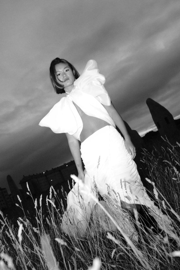 The "Bowie" silk organza halter top is an original and bold piece, featuring a large front bow whose ends form the body of the top, leaving the back exposed. It fastens at the neck with covered buttons and at the back with an inner tab, while a long train flows down to the floor.